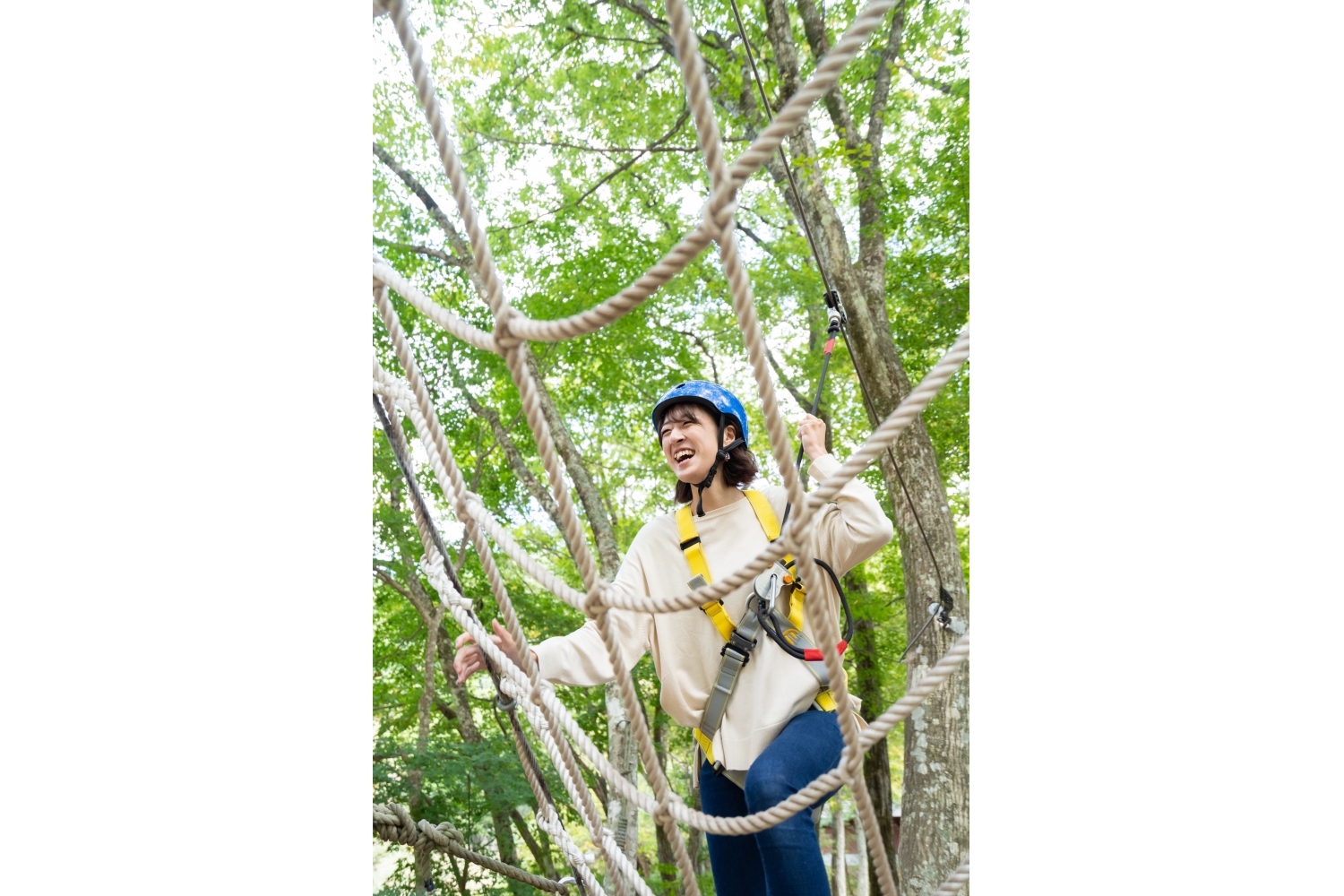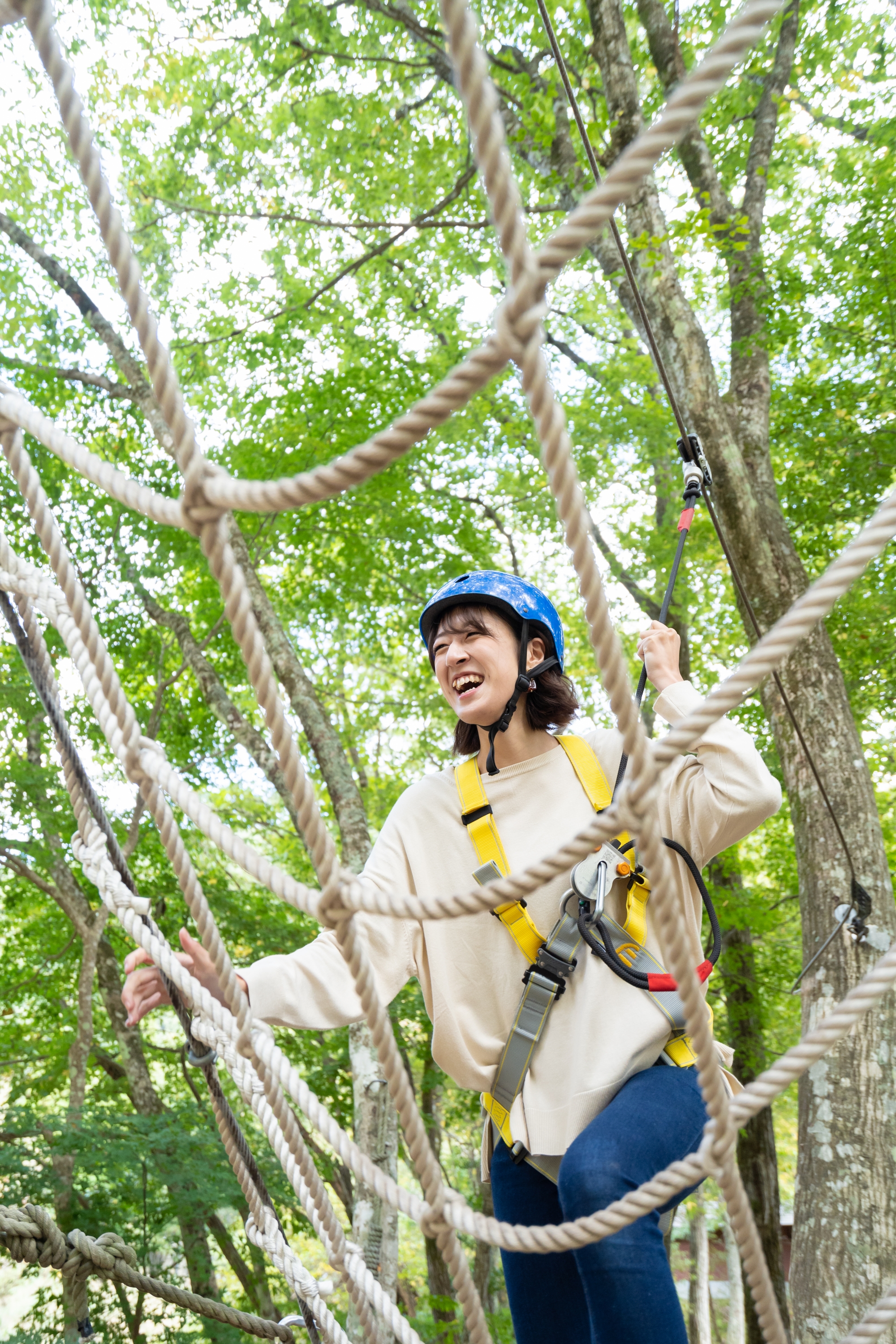 木々の間、地上約8メートルのところに張られたロープにそって色々な関門をクリアしていくアドベンチャー施設です。コースは約220メートルあり、命綱をつけてまわります。途中動けなくなってもスタッフがサポートしてくれるので安心して冒険が楽しめます。