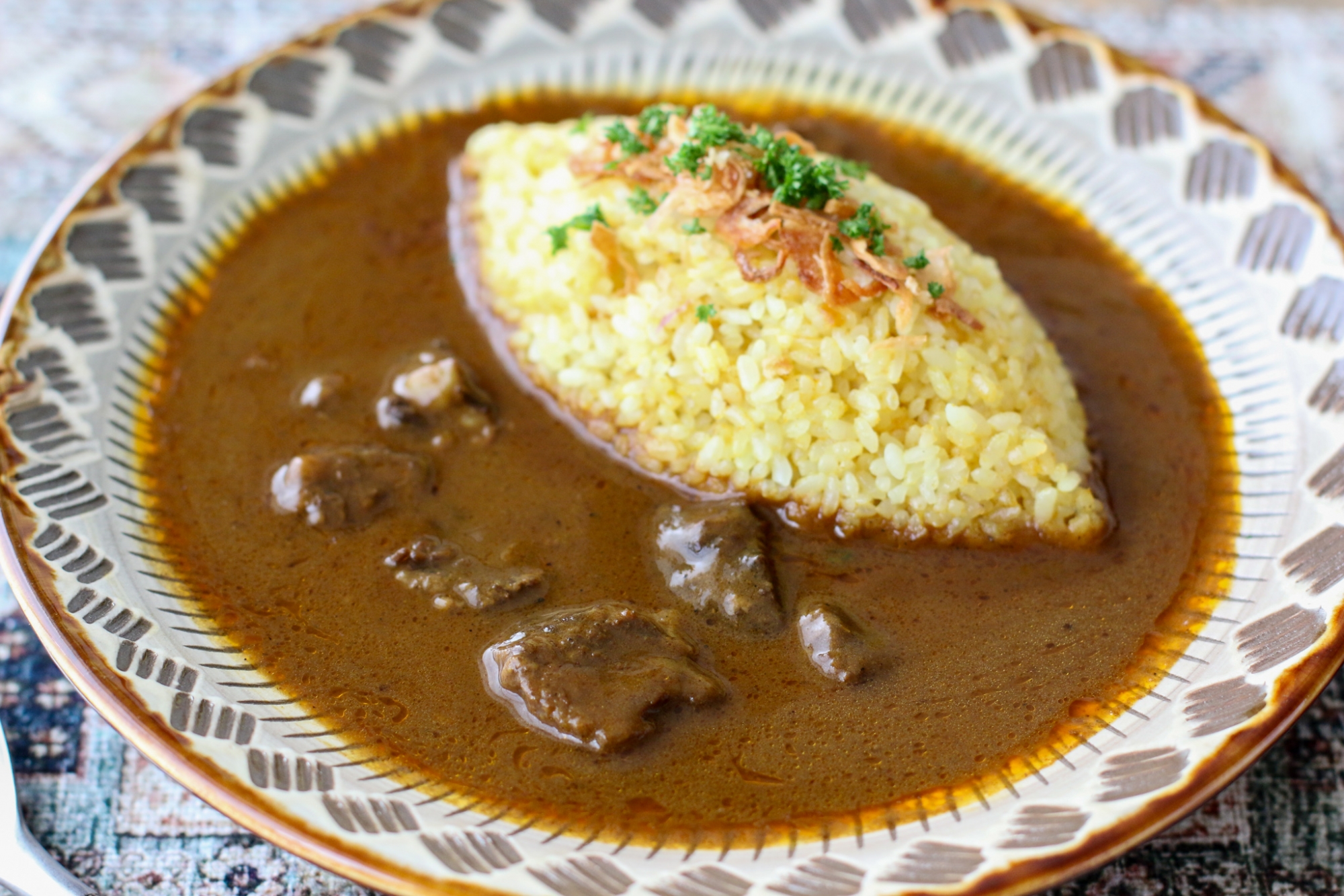 ここのカレーは、庄原の美味しい水で煮出したチキンブイヨンと8時間もかけてじっくり炒めた玉ねぎがベースになっています。そこにシェフ特製のスパイスと比婆牛のうま味が加わります。