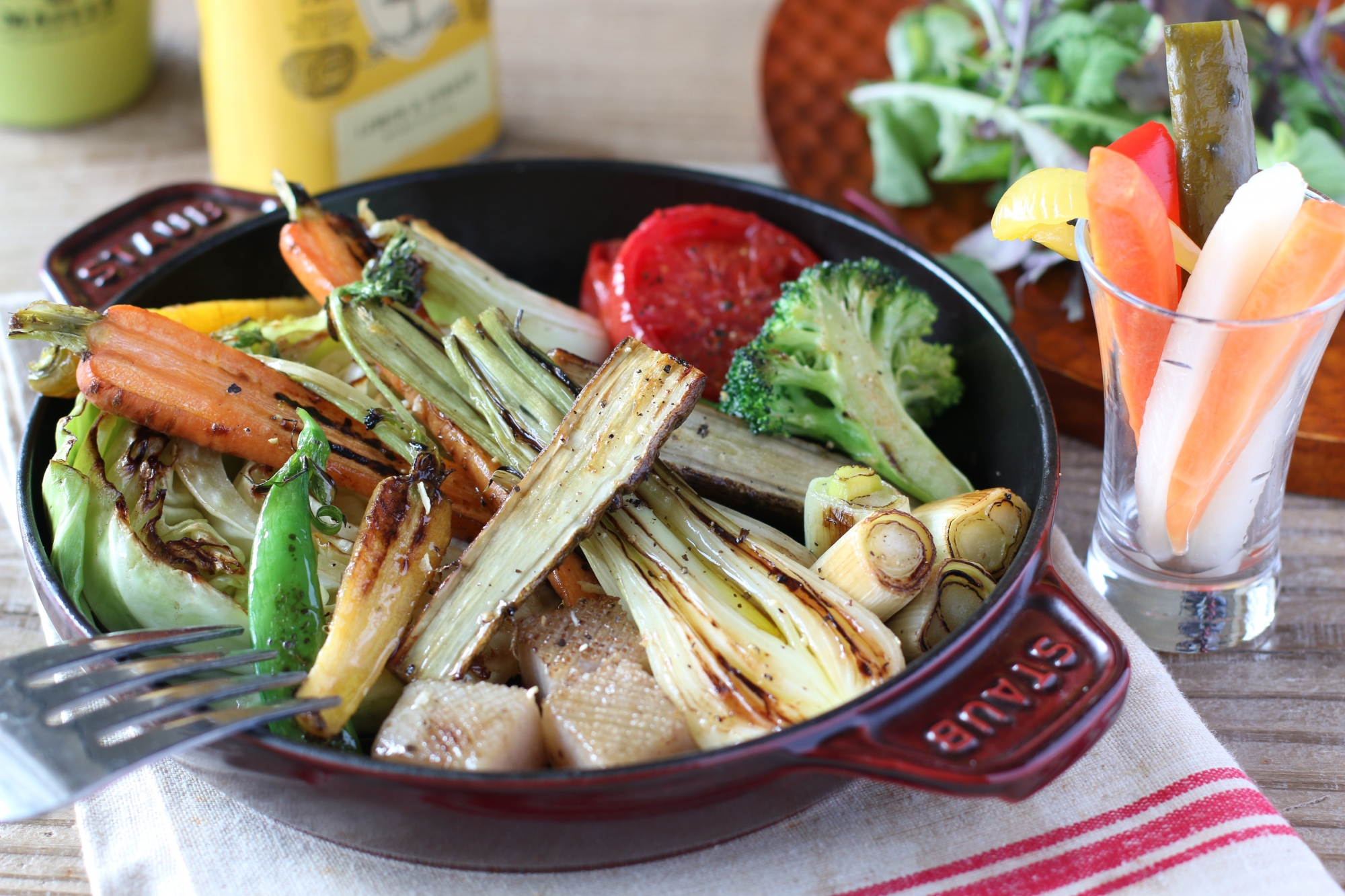 新鮮な野菜には、水分も多く、栄養価も高いのです。こういう場合は、厚手の鍋でじ~っくり焼きます。できるだけ弱火でゆっくり加熱することが焼き野菜を美味しくするコツなのです。無水調理(ほぼ野菜の水分で調理する)ができる鍋があると最高です。