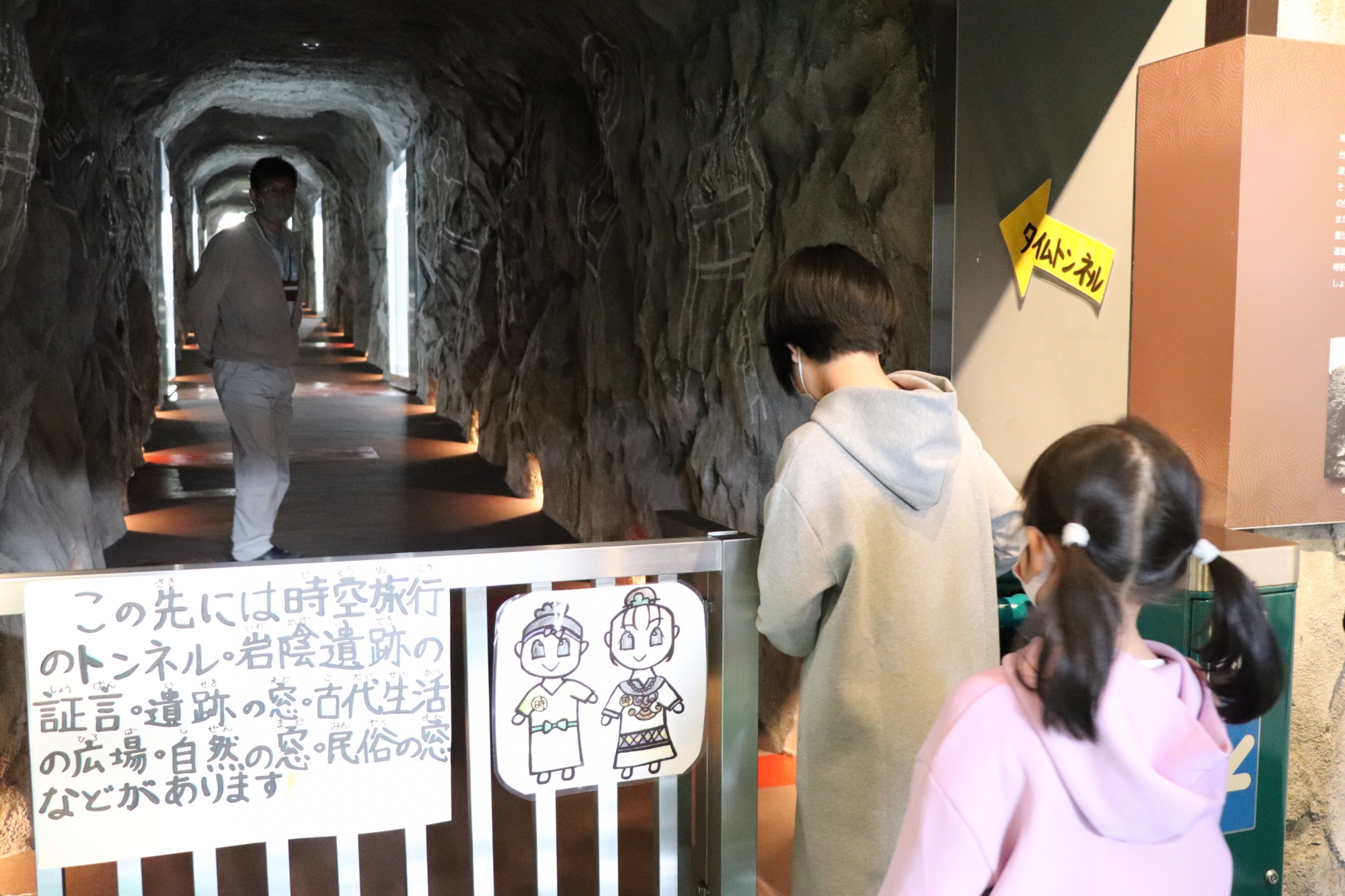 館内には長いタイムトンネルが。トンネルを進むにつれて古墳時代~弥生時代~縄文時代と、タイムスリップしていきます。ちなみに館内の説明文や展示物の解説パネルは、地元の東城小学校6年生の子どもたちが作成したのだそう。