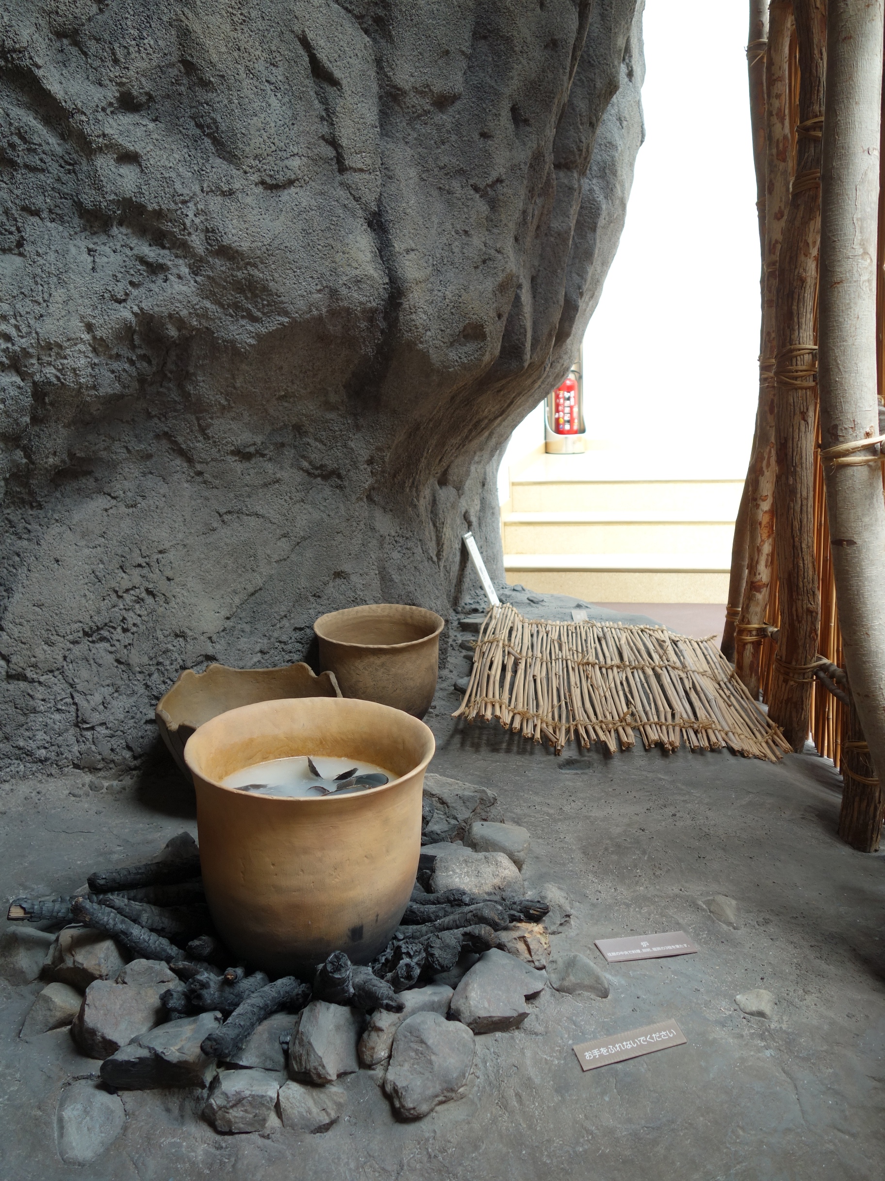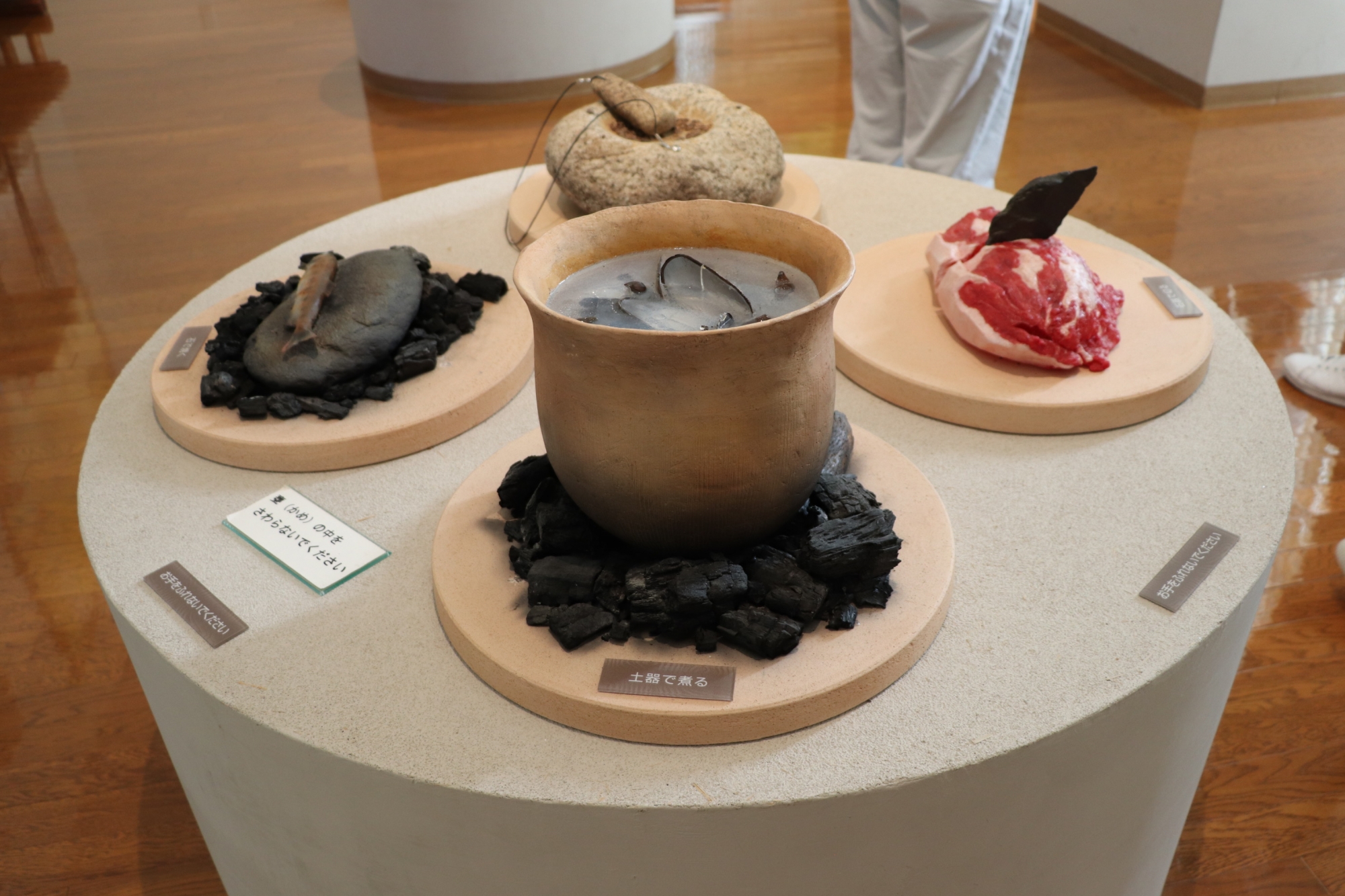 続いて私たちが向かったのは、縄文時代と弥生時代の暮らしを復元したコーナー。こちらでは、縄文時代の調理法を体験できる道具も。