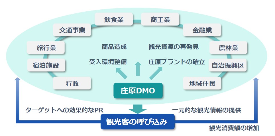 一般社団法人庄原観光推進機構(庄原DMO)は、観光を切り口に庄原市の経済や暮らしを豊かにするため、マーケティングに基づく「魅力ある観光商品やサービス」を開発し、戦略的に観光客を呼び込む組織です。2020年4月、一般社団法人庄原市観光協会を改組し、発足しました。